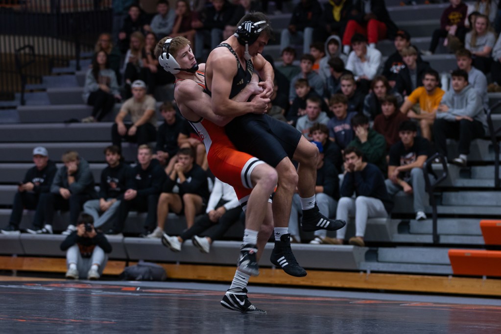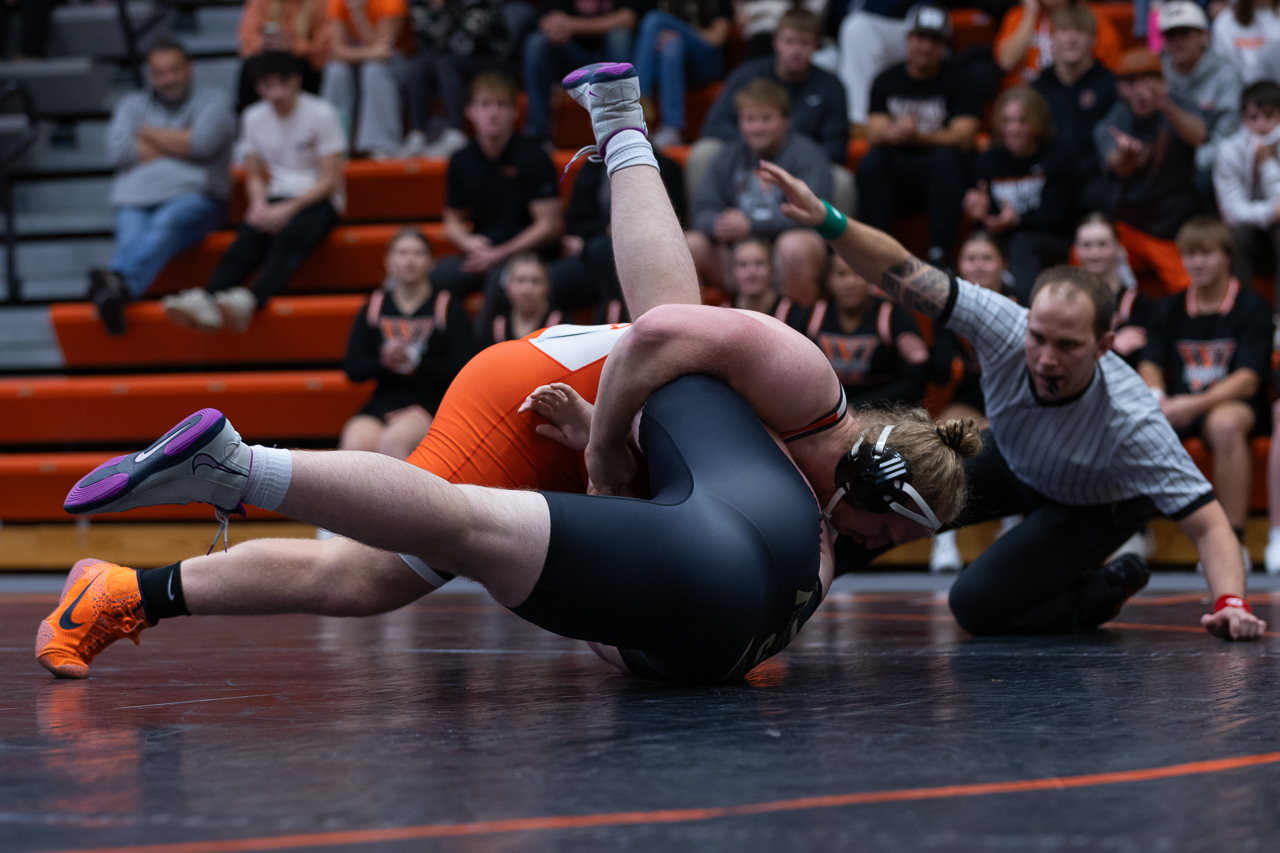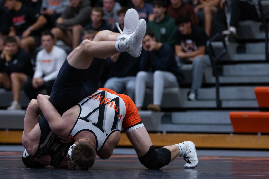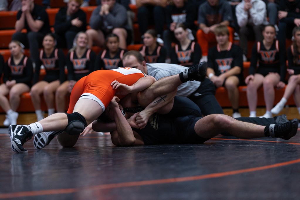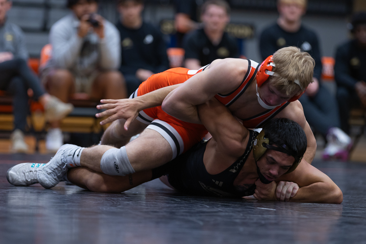No. 14, junior Aiden Brosinski, attempts to pin his Nebraska Wesleyan opponent in the 165-pound weight class. Photo by Ali Parkhurst.