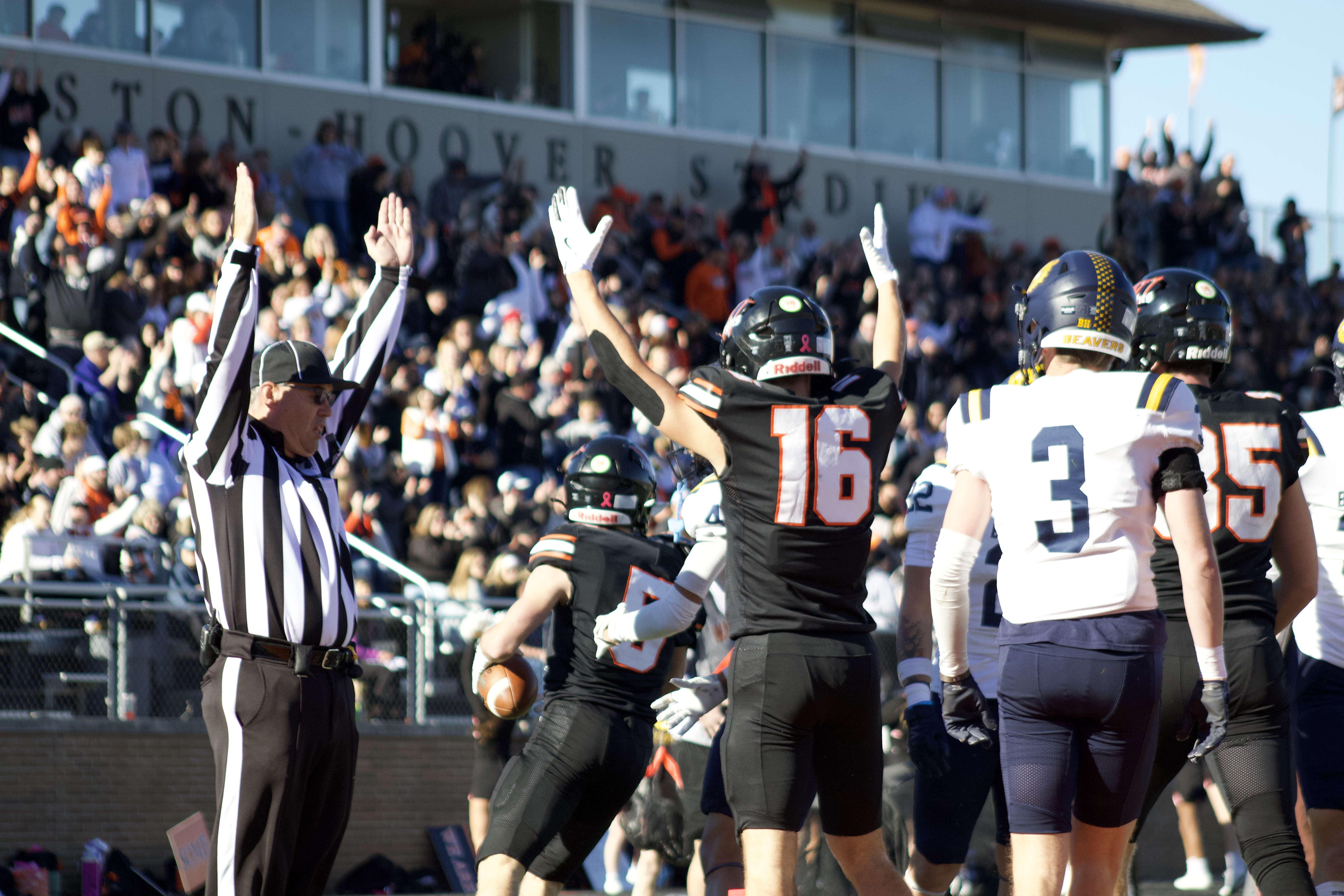 Tight end Sam Heither is lifted in the air after scoring a touchdown against Buena Vista University on Nov. 15. Photo by Madi Petersen.