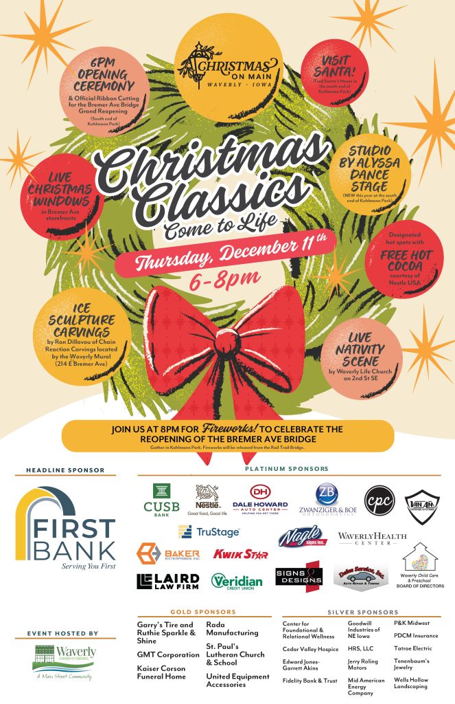 More specific info about events during Christmas on Main is available on the poster below. Other events hosted by the City of Waverly and the Chamber of Commerce are posted on the calendar on the City of Waverly website.